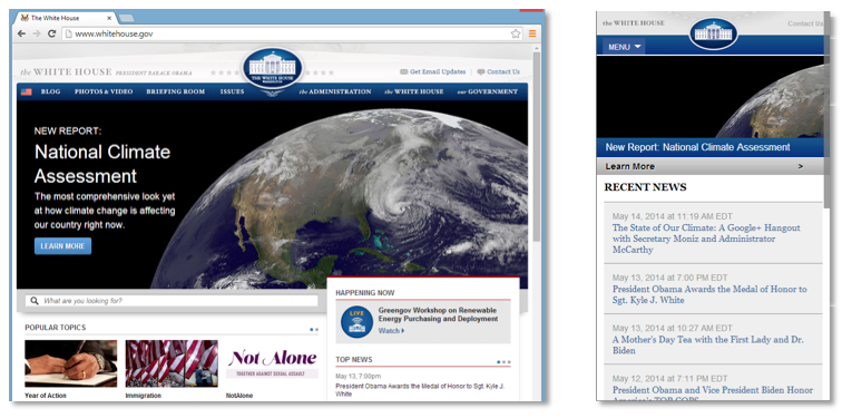 Figure 3: Accessing www.whitehouse.gov on a desktop (left) and m.whitehouse.gov on a mobile device (right). The site employs server-side redirection to serve the correct content to mobile devices.