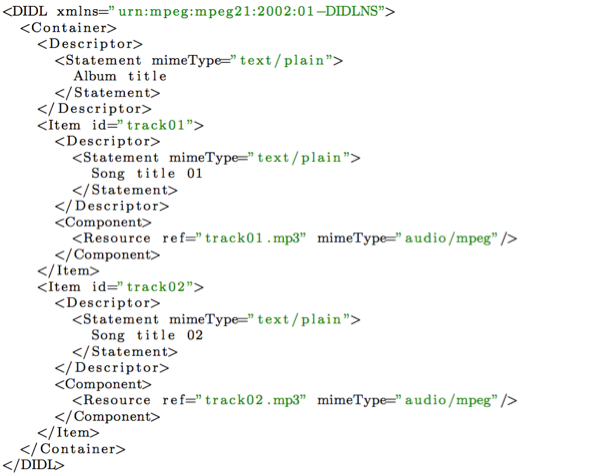 Listing 3 shows an example of an MPEG-21 DID document. The DIDL element is the root element. A container element corresponds to IMS CP organization and METS structMap elements and describes the structure of the resource aggregation. In the example, the container element groups two item elements, track01 and track02. MPEG-21 items correspond to IMS CP items and METS div elements. These items bind components to descriptor elements. Such components, then, correspond to IMS CP Resource and METS file elements.