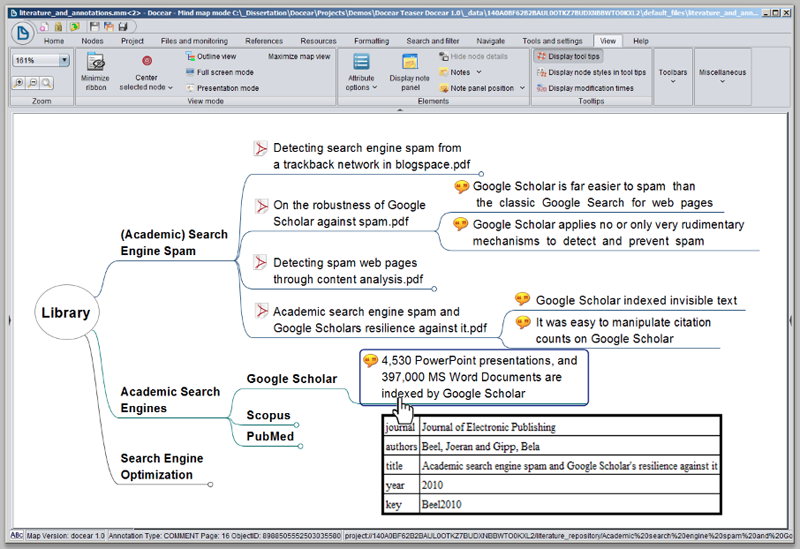 Docear is an open source literature suite for organizing references and PDFs, including the PDFs' annotations. Docear is available for Windows, Mac OS, and Linux and offers a recommender system for publicly available research papers on the Web. In contrast to most other reference managers, Docear uses mind-maps for the information management. Figure 1 shows a screenshot depicting the management of PDFs in Docear, including annotations. A user can create several categories (e.g. "Academic Search Engines") and sub-categories (e.g. "Google Scholar"). Each category contains a number of PDFs, and for each PDF, its annotations that are made by the user — e.g. highlighted text, comments, and bookmarks — are displayed. If the cursor is moved over a PDF or annotation, the PDF's bibliographic data such as the title and authors, is shown.