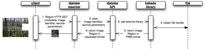 Table 3: OpenURLs to request a Region and Metadata for an image 3.4. Key Featuresdjatoka is open source Java software that builds upon a rich set of APIs and libraries to provide a service framework for the dynamic dissemination of JPEG 2000 image files (Figure 3). The djatoka API provides: