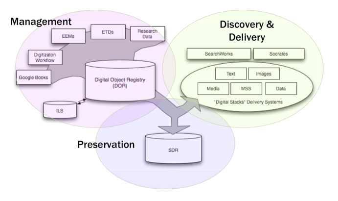 Figure 2: Stanford's digital library ecosystem has three main spheres: Management, Preservation and Access